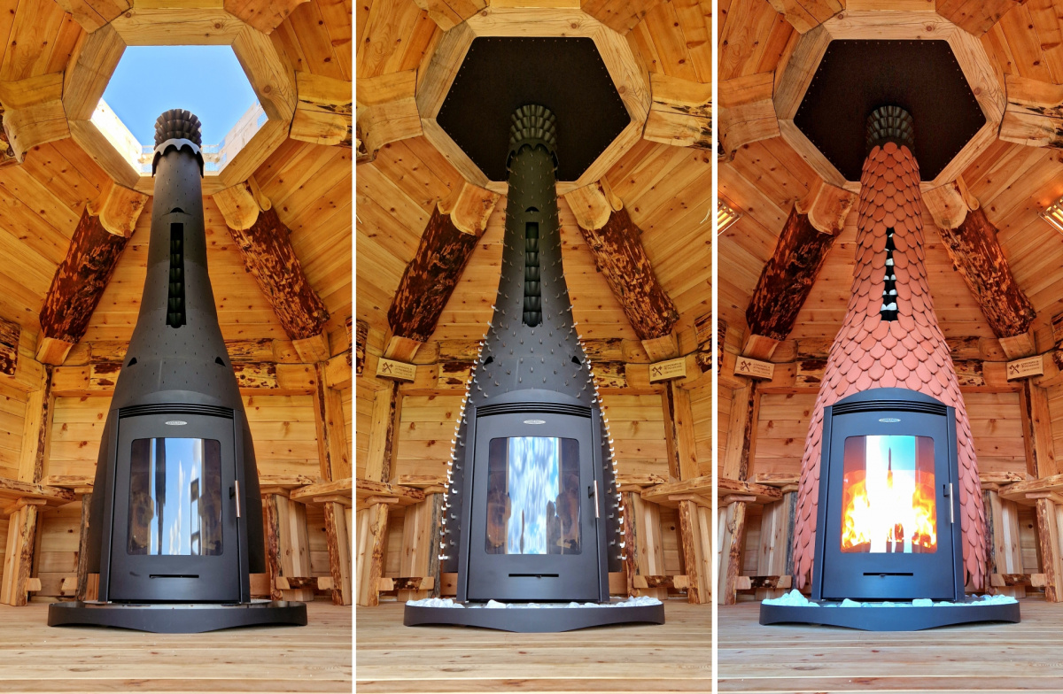 Сочетает в себе функциональность и эстетику, единство технологического и природного начал. У этой печи нет привычных плоских или цилиндрических поверхностей — поверхности декора трёхмерные и плавные.